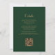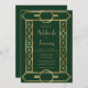 Este elegante convite de casamento inspirado na vintage apresenta texto dourado num fundo verde esmeralda escura, enquadrado por uma na moda vintage geométrica deco border em folha de ouro falsa. O verso fornece espaço para detalhes do casamento em um fundo verde sólido, junto com um código QR que os convidados podem digitalizar para visitar seu site e RSVP, o que economiza o custo de imprimir e enviar cartões RSVP separados.