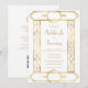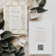 Este elegante convite de casamento inspirado na vintage apresenta texto dourado num fundo branco, enquadrado por uma na moda vintage geométrica deco border em folha de ouro falsa. O verso fornece espaço para detalhes do casamento em um fundo branco sólido, junto com um código QR que os convidados podem digitalizar para visitar seu site e RSVP, o que economiza o custo de imprimir e enviar cartões RSVP separados.