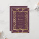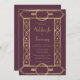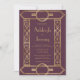 Este elegante convite de casamento inspirado na vintage apresenta texto dourado num fundo vermelho burgundy, enquadrado por uma na moda vintage geométrica deco border em folha de ouro falsa. O verso fornece espaço para detalhes do casamento em um fundo sólido de burgundy, junto com um código QR que os convidados podem digitalizar para visitar seu site e RSVP, o que economiza o custo de imprimir e enviar cartões RSVP separados.