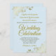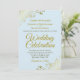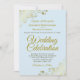 Este belo convite de casamento é na moda, simples e elegante. Apresenta uma inscrição dourada sobre um fundo azul pálido e em pó, com um filtro de folhas florais em cada canto. A design subestimada é compensada pelas ampolas e espirais do trabalho de arte. A parte traseira tem um código QR personalizável e uma nota de detalhes para que você possa direcionar seus convidados para um site para informações e RSVP.