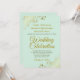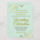 Este belo convite de casamento é na moda, simples e elegante. Apresenta uma inscrição dourada num fundo verde-hortelã-claro, com um filtro de folhas florais em cada canto. A design subestimada é compensada pelas ampolas e espirais do trabalho de arte. A parte traseira tem um código QR personalizável e uma nota de detalhes para que você possa direcionar seus convidados para um site para informações e RSVP.