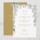 Um convite de casamento floral com flores silvestres elegante com seus detalhes de celebração de casamento em tipografia de ouro chico. Com os detalhes do seu site de casamento e o seu código QR no sentido inverso. Projetado por Thisnotme©