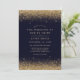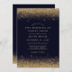 Comemore em estilo com este convite moderno para o casamento, apresentando detalhes luxuosos de confete de ouro contra um fundo azul marinho profundo. Este convite incorpora elegância e sofisticação, perfeito para casamentos noturnos ou celebrações glamourosas. A combinação de cores ricas e o design contemporâneo criam um convite memorável adequado para qualquer estação — primavera, verão, outono ou inverno.