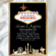 Este convite de casamento apresenta um tema clássico de Las Vegas num fundo negro. Uma imagem do horizonte de Vegas é impressa na parte inferior do padrão dourado. Um quadro dourado correspondente borda o convite. O símbolo clássico "bem-vindo a Las Vegas" está impresso no topo. Você pode personalizar o sinal para incluir suas próprias informações de casamento personalizadas ou outro texto.