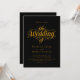 Este elegante convite de casamento preto e ouro é perfeito para um casamento moderno. O simples design apresenta uma elegante caligrafia dourada sobre fundo preto. O cartão de convite inclui os detalhes do casamento no verso, em vez de pagar um cartão separado.