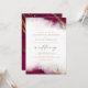 Este elegante convite para o casamento mostra um design vermelho-borrifado de borda de água em imitação de mármore veinado com folha de ouro falsa, desaparecendo gradualmente no fundo branco. A palavra "casamento" aparece em escrita manuscrita dourada, com o texto remanescente em maiúsculas de serifa douradas. O padrão de burgundy e dourado é repetido na parte de trás da carta.