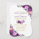 O Cartão de Convite para Casamento Dourado e Floral Ultra Violet Púrpura a Aquarela inclui flores roxas e verde botânico. Estilo do suporte.