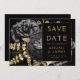 Este elegante e melancólico casamento Salve o cartão de Data apresenta um buquê floral romântico e luxuoso a preto com folha de ouro e folhagem brilhante num fundo negro. Personalize o texto dourado em fontes na moda em um retângulo preto bordado por ouro e adicione o URL do site de casamento ao fundo preto sólido.