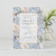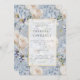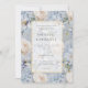 Este design apresenta um belo padrão floral rústico, azul e branco, de periwinkle, em um fundo empoeirado de azul-piscadela. O texto é exibido em uma área de texto transparente branca suave com um quadro de brilho dourado sujo. a parte de trás continua o padrão floral. Este cartão faz parte da suíte de casamento Blue & White Rustic Floral Dourado Frame, criada pela Simply Farmhouse Press.