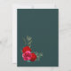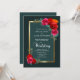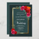 Convite para casamento floral vermelho e rosa elegante, com uma profunda borda verde e dourada e um painel de interior teal para destacar os detalhes do convite.
