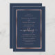 Convite de casamento Elegante, azul e marinho, com fonte moderna de escrita. Personalize facilmente este cartão de casamento moderno com os seus detalhes de casamento, dentro de um quadro de ouro rosa.
