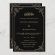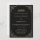 Esta é uma elegante e eterno carta de convite ao casamento islâmico. Ele tem uma cor preta sólida com uma tipografia dourada simples de escrita. A caligrafia árabe está escrita em ouro. Há um antigo design de espiral barroco floral antigo no canto da armação. Você pode personalizar este cartão de convite com a ajuda da Ferramenta Design. Você pode editar este modelo personalizado imprimível alterando os nomes da noiva e do noivo felizes, os detalhes do evento e o endereço do local. Cerimônia da Nikah. Casamento. Ornamentado de papelaria de casamento. Celebração. A linha dela para o design de copyright no Zazzle.