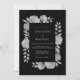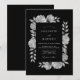 Este design apresenta uma estética monocromática impressionante com rosas brancas delicadas e folhagens botânicas contra um fundo preto profundo. A paleta de alto contraste cria um clima sofisticado ideal para eventos formais noturnos. Folhas graciosas e pétalas macias fornecem um toque romântico ao cenário sombrio dramático.