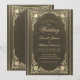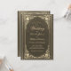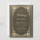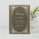 Este convite de casamento elegante com um ar vintage, recomendado para um casamento mais formal, "black tie", tem uma moldura dourada vintage com elegantes decorações barrocas em ouro sobre um fundo preto que imita couro. Os nomes da noiva e do noivo e a palavra Casamento são escritos em uma fonte caligráfica elegante. Todo o texto pode ser personalizado e tem uma cor dourada semelhante à moldura dourada vintage.