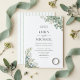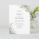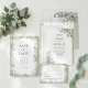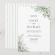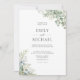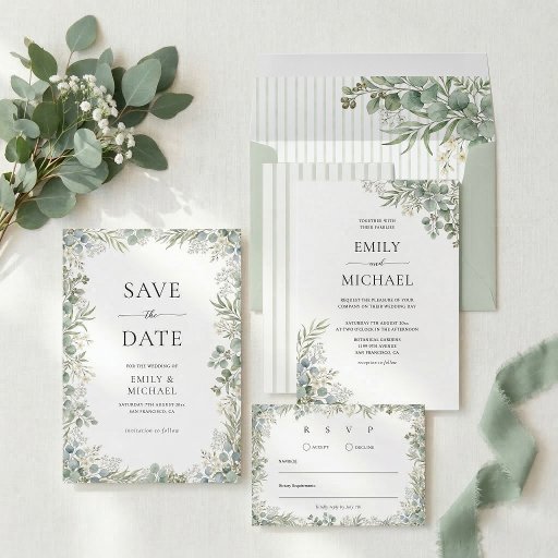 Celebre o seu amor com este convite de casamento botânico elegante com folhagem. O design apresenta delicada folhagem de eucalipto pintada à aguarela e flores brancas combinadas com um verso listrado em verde-sage clássico. Perfeito para casais que planejam uma cerimônia ao ar livre sofisticada no verão ou uma celebração romântica no jardim.