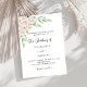 Fundo branco, decorado com flores brancas, peões e verde. Personalize e adicione o nome da noiva a ser e os detalhes da festa. Letras pretas e ouros coloridas.