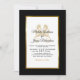 Convide seus hóspedes para ajudá-lo a celebrar seu dia especial com este convite elegante que inclui textos modernos, preto e dourado, incluindo cavalos de mar artísticos e um quadro metálico de folha de ouro na frente do cartão. Um fundo preto está na frente e atrás.