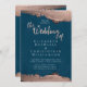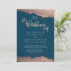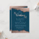 Convite de casamento elegante e moderno para os casais de hoje. Design de metal de bronze falsa para um olhar contemporâneo. Fundo azul com texto branco.