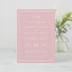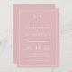 Simples convite de casamento com um design moderno, mas elegante, com seu monograma de duas letras no topo, um esquema de data ousado e seus detalhes cercados por uma fina borda. Todo o texto está branco sobre um fundo rosado rosa poeirento. As fontes e as cores de fundo podem ser alteradas para qualquer cor desejada. Um design chic e na moda que é excelente para um casal minimalista.