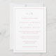 Convite simples de casamento completo, com um design moderno, mas elegante, com seu monograma de duas letras no topo e seus detalhes cercados por uma fronteira fina. Todos os elementos de design são cor-de-rosa rosa empoeirado sobre um fundo branco e podem ser alterados para qualquer cor desejada na ferramenta de edição design. A parte de trás tem todos os seus detalhes de casamento, eliminando a necessidade de um cartão separado, fazer que este seja um pacote de convite para casamento amigável. Um design chic e na moda que é excelente para um casal minimalista.