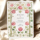Convide seus convidados em estilo eterno com este belo convite de casamento inspirado pela beleza do movimento Art Nouveau. A design apresenta uma delicada e intrincada borda de rosas rosa estilizadas e folhas verdes vindas, criando uma armação espantosa para seus detalhes de casamento. A textura macia da aquarela e a tipografia clássica evocam um senso de romance vintage e elegância artística. Perfeito para um casamento de jardim, uma celebração clássica, ou para qualquer casal com apreço pela arte histórica, este convite certamente fará uma bela primeira impressão. Um monograma personalizável no topo adiciona um toque pessoal.
