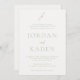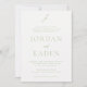 Convite de casamento elegante com um design clássico com seu monograma em uma fonte de script junto com seus nomes e detalhes em uma fonte serif tradicional.