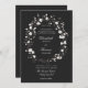 Delicar flores silvestres e gramíneas entrelaçam-se para formar uma adorável coroa floral de casamentos neste moderno convite formal, elegante, preto e branco. Design elegante e eterno para o romântico moderno, esse convite floral combina o tema formal preto-e-branco com a estética feminina e lúdica das flores silvestres para a perfeita mistura de elegantes sofisticados.