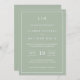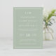 Simples convite de casamento com um design moderno, mas elegante, com seu monograma de duas letras no topo, um esquema de data ousado e seus detalhes cercados por uma fina borda. Todo o texto está em branco sobre um fundo verde sábio. As fontes e as cores de fundo podem ser alteradas para qualquer cor desejada. Um design chic e na moda que é excelente para um casal minimalista.