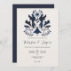 Este design de Convite Elegante Mínimo Moderno Azul Mexicano apresenta um charmoso motivo simétrico em um marinho azul profundo, colocado contra um fundo branco suave. No centro estão dois pombinhos estilizados se encarando, segurando um delicado caule de flores entre eles, coroados por um coração — simbolizando unidade e romance. Cercado por formas orgânicas, folhetos florescem, e curvas gentis, o design irradia elegância de arte folclórica com um toque moderno minimalista, deixando amplo espaço abaixo para texto personalizado de casamento.