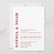 Este convite apresenta um fundo branco sofisticado com um design minimalista. Os nomes do casal são destacados em negrito, elegante tipografia em vermelho, acrescentando um toque de elegância moderna ao convite.