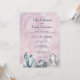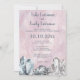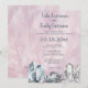 Convites de casamento elegantes com fundo rosa pastel em aquarela pincelada. Na base dos cartões estão cristais e geodos cinzas e azuis. Este cartão tem um estilo boho chic com um toque de elegância, perfeito para impressionar seus convidados. Personalize com nomes e todos os detalhes do casamento.