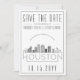 Um convite de casamento único para salvar a data, para um casamento que acontecerá na bela cidade de Houston. Este convite apresenta uma ilustração estilizada da linha do horizonte única da cidade com seu nome embaixo. Isto é seguido pelas informações do seu dia de casamento em um estilo aberto e alinhado correspondente. No verso do convite há uma cor cinza escuro para complementar a aparência e a sensação. Todos os elementos individuais do cartão de convite são desbloqueados para que você possa alterar quaisquer detalhes necessários, como tamanhos de fonte, estilos e muito mais, usando a função de personalização. Você pode adicionar uma foto no verso e aplicar um filtro preto e branco a ela. Divirta-se sendo criativo e fazendo com que seja seu!