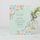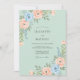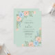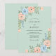 Este design apresenta um cenário sereno em verde menta adornado com delicadas flores em aquarela. Rosas em pêssego suave e anêmonas azul pálido criam uma estética romântica inspirada na primavera. Folhagem verde exuberante e pequenas bagas azuis adicionam textura e um senso de elegância natural. A paleta arejada evoca uma atmosfera pacífica e caprichosa.