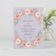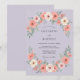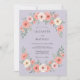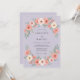 Este design apresenta um fundo suave de lavanda adornado com delicados sprays florais. Rosas cor de pêssego exuberantes e flores creme são equilibradas por folhas de sage verde suave para uma estética romântica. A composição aérea cria um visual gracioso perfeito para um evento sazonal de primavera ou verão. A paleta de cores combina tons pastel para um visual sofisticado e etéreo.