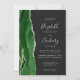 A borda esquerda deste elegante convite de casamento moderno apresenta um caçador de aquarela verde agata borda com falso brilho prateado. O texto personalizável combina escrita manual, placa de impressão e fontes itálicas em cinzas prateadas em um fundo fora do preto. O verso apresenta um design verde e prateado correspondentes.