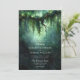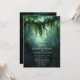 Uma ilustração com uma aquarela esbranquiçada de um galho grosso de árvores florestais com folhagem esmagadora e videiras em verde esmeralda, cintilante com luzes de fadas e poeira mágica, decora este convite de casamento outono de verão com um tema de floresta encantada. Um convite elegante e moderno para um casamento de conto de fadas. Perfeito para noivas que amam o cenário da floresta de conto de fadas, o tema da floresta de fadas ou do jardim de fadas, o tema da floresta moderna e o verde esmeralda.