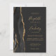 A borda esquerda deste convite de casamento moderno e elegante apresenta uma borda de ágata em aquarela preta aparada com brilho de ouro falso. O texto personalizável combina caligrafia dourada, copperplate e fontes itálicas em um fundo preto claro. O verso apresenta um design de ágata preto e dourado correspondente.