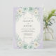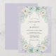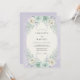 Este design apresenta um fundo suave de lavanda com uma bela disposição de flora em aquarela. Rosas delicadas em verde menta e flores creme estão aninhadas entre folhas de eucalipto prateadas e raminhos de lavanda. A paleta de cores etéreas de roxo pastel, azul-turquesa e branco cria uma atmosfera romântica e serena para um evento de primavera.
