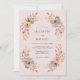 Flores de pêssego e taupe suaves criam um arranjo romântico e etéreo sobre um fundo rosado. Este design evoca um clima sonhador e suave perfeito para uma ocasião sofisticada. Elementos florais delicados sugerem uma mistura harmoniosa da beleza da natureza.