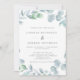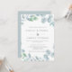 Um bonito convite para o casamento, com azul/cinza suave e azul e folhas de eucalipto botânico verde cor d'água, sobre fundo branco. O reverso está em azul sólido empoeirado. Este convite funciona lindamente para qualquer estação, mas seria especialmente excelente para um casamento no inverno.