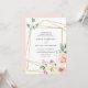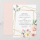 Convites de casamento elegantes e florais com detalhes de seu casamento cercados por uma estrutura geométrica de folha de ouro falsa adornada com buquês de flores cor-de-rosa pincelado, púrpura e branca (peonias e rosas) e de folhas de eucalipto verdes exuberantes. Os convites florais femininos se revertem a um fundo rosa-claro.