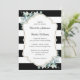 Cartão de casamento preto e branco moderno, com folhas de eucalipto em fundo listrado preto e branco. Itens correspondentes disponíveis.