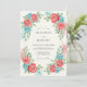 Um delicado design em aquarela apresenta rosas corais entrelaçadas com flores azuladas suaves e folhas verdes exuberantes. O estilo arejado e pictórico evoca uma atmosfera romântica e caprichosa, perfeita para uma ocasião de primavera ou verão.
