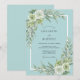 Flores delicadas e folhagens rastejantes adornam este design sereno. Rosas verdes suaves e hortênsias são complementadas por folhagens exuberantes, criando uma atmosfera elegante e arejada para o seu dia especial. O fundo azul-turquesa fresco adiciona um toque de charme sofisticado.