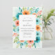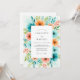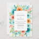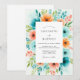 Um arranjo floral vibrante em aquarela explode com tons de turquesa, laranja e coral, cercando uma área central para detalhes do evento. Este design animado evoca uma sensação de romance alegre, perfeito para uma celebração de clima quente.