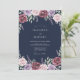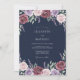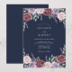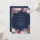O rico burgundy e as suaves flores de lavanda se entrelaçam com folhagens delicadas. Este design evoca uma atmosfera romântica e elegante, perfeita para uma ocasião sofisticada. O fundo azul-marinho profundo realça os vibrantes acentos florais.