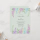 Delicadas flores em tons de lilás, azul suave e amarelo pálido em aquarela se espalham por um fundo verde sereno. Vegetação exuberante emoldura essa cena romântica, evocando uma atmosfera suave e aérea perfeita para um evento na primavera ou verão. A obra sugere uma celebração leve e alegre.