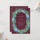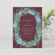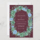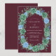 Este design apresenta um rico fundo borgonha adornado com uma abundante coroa de suculentas macias verdes e delicadas flores azuis. A estética geral evoca um sentimento romântico e naturalista, perfeito para uma ocasião elegante ao ar livre ou botânica.