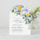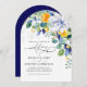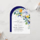Um convite para casamento de arco colorida radiante com uma bela folhagem botânica verde-aquática e folhas de eucalipto e elegantes flores brancas e ensolaradas. A caligrafia é elegante e chique e pode ser facilmente personalizada. A escolha perfeita para casamentos de verão primavera.
