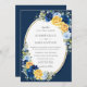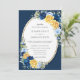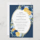 Este convite de casamento encantador apresenta cor d'água azul real, azul empoeirado, floral amarelo, folhagem verde eucalipto e fundo azul marinho profundo. Personalize-o com seus detalhes de forma fácil e rápida, basta pressionar o botão personalizar para reorganizar e formatar o estilo e a colocação do texto. c) O Feliz Cat Studio